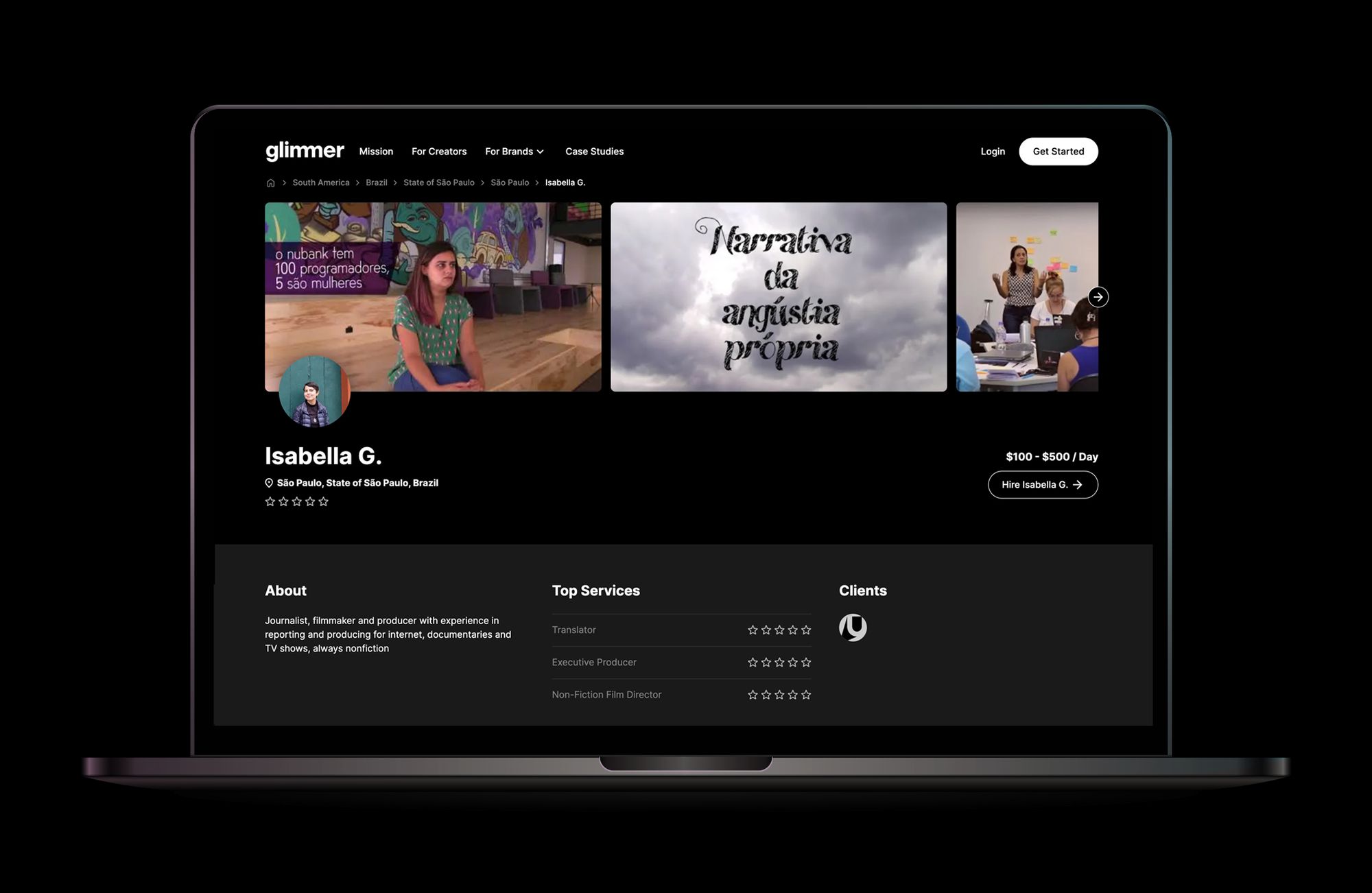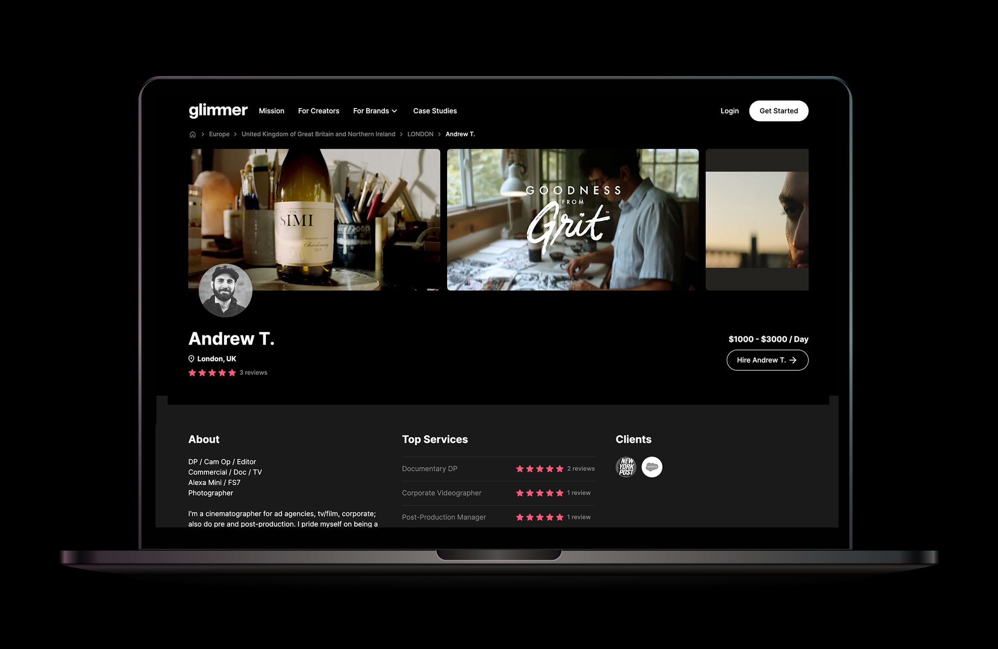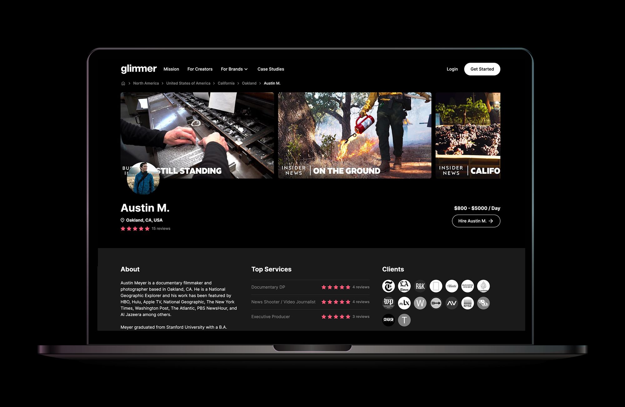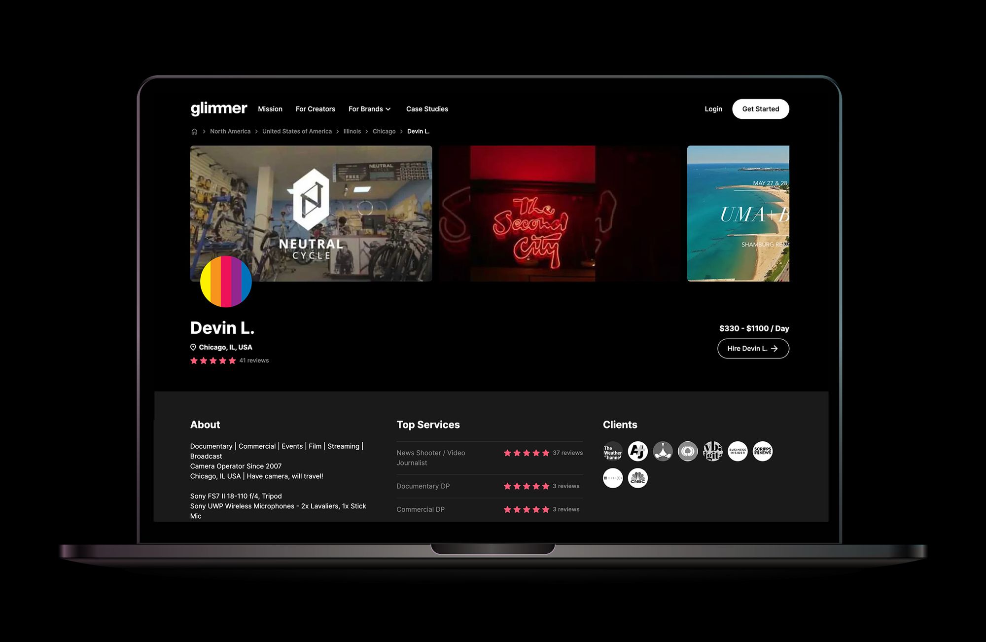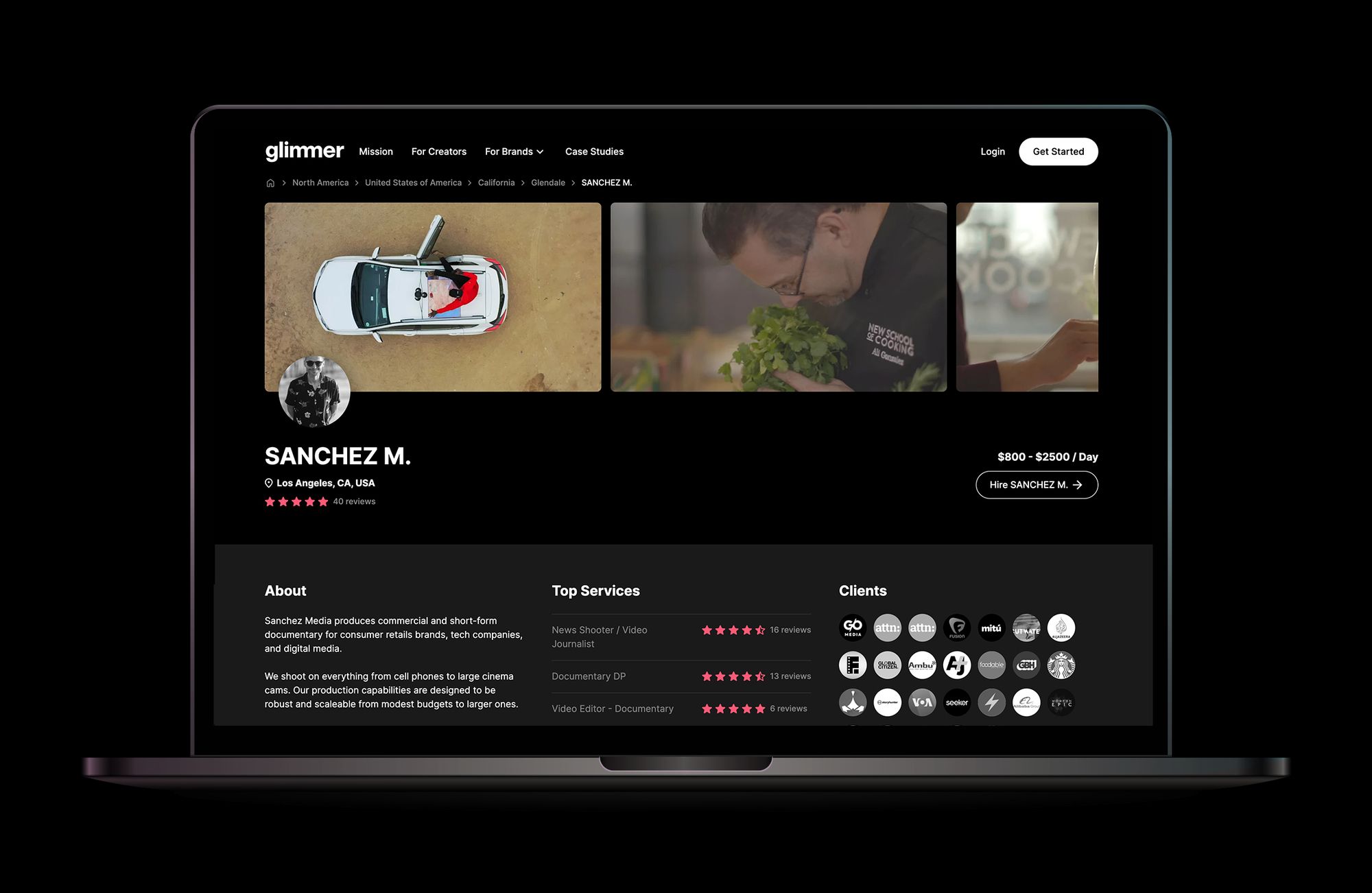 Another superstar Glimmer freelancer in LA, Alan Sanchez, produces commercial and short-form documentary content for brands, media and tech companies. His team shoots on all types of cameras, from smartphones to large cinema cameras. Alan is fluent in English and Spanish and has crafted stories for clients such as Global Citizen, G/O Media, Seeker, and Propper Daly.