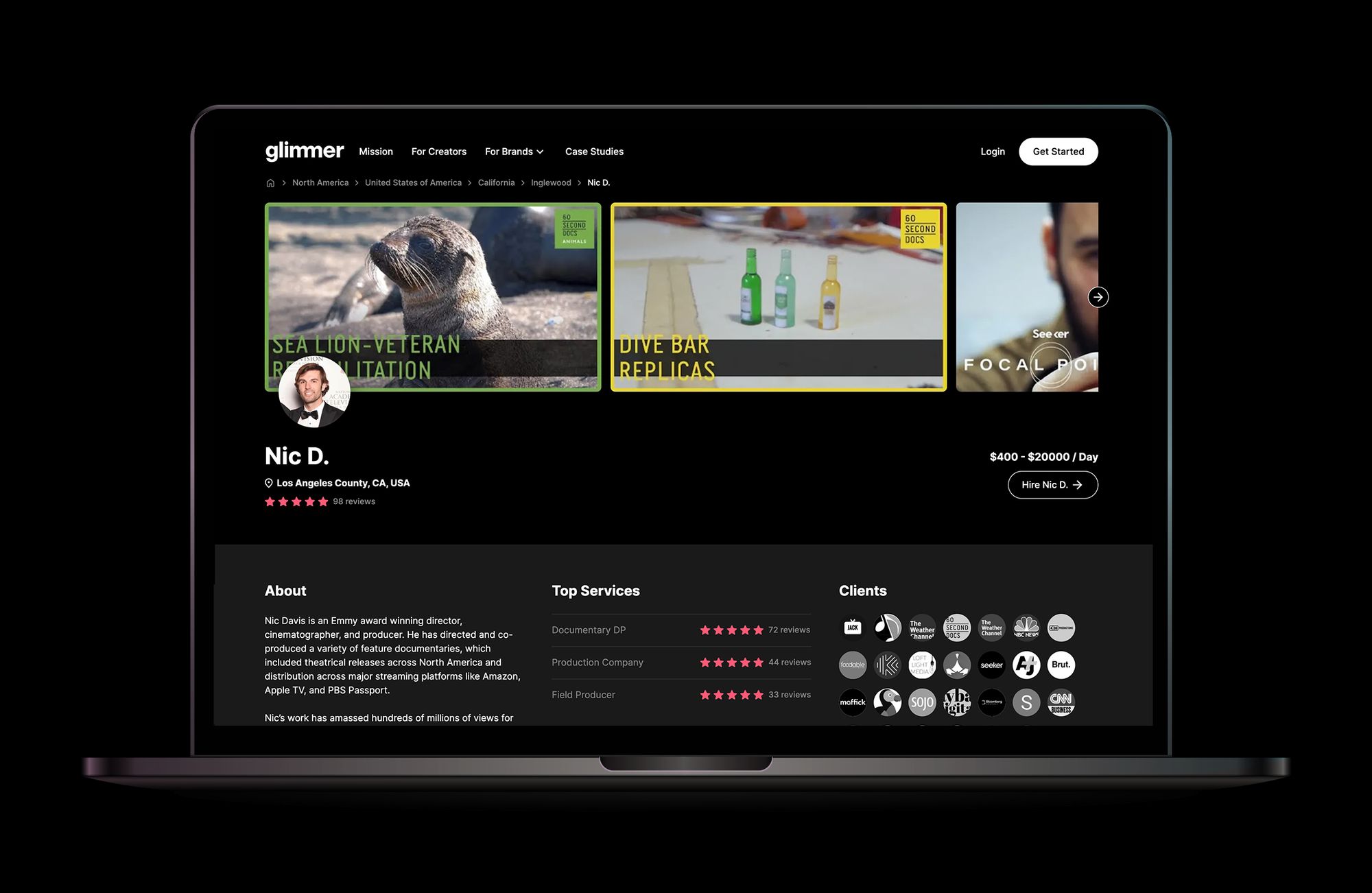 Nic Davis is an Emmy-winning director, cinematographer, and producer for documentaries, major brands, and digital productions. His clients have included BBC, Live Nation, Daimler-Benz, Discovery, Cadillac and artists including Jason Mraz, Pearl Jam, and Dave Matthews.