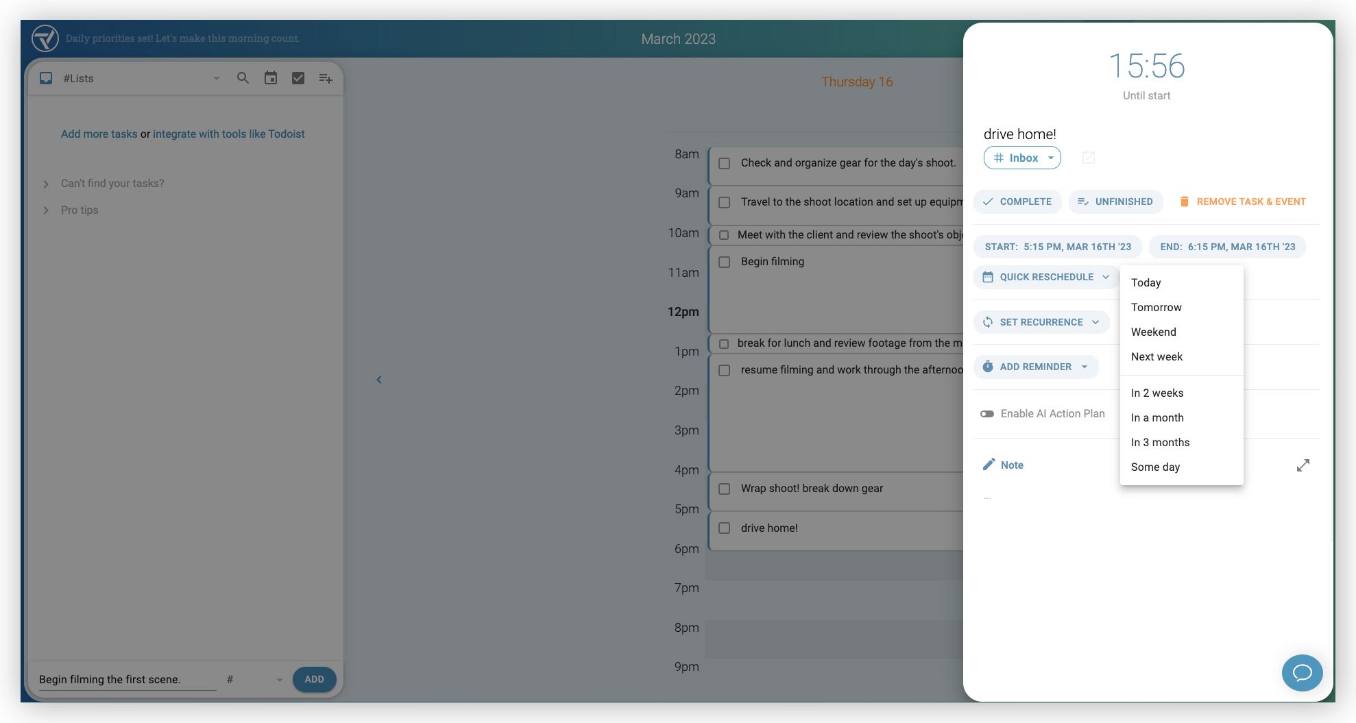 I also love the deep-focus feature, which automatically blocks your time for you based on your preferences for deep work (work requiring consistent focus on a single task.) There’s also the “quick reschedule” function, allowing you to move events to another day seamlessly - great if a shoot gets rescheduled.