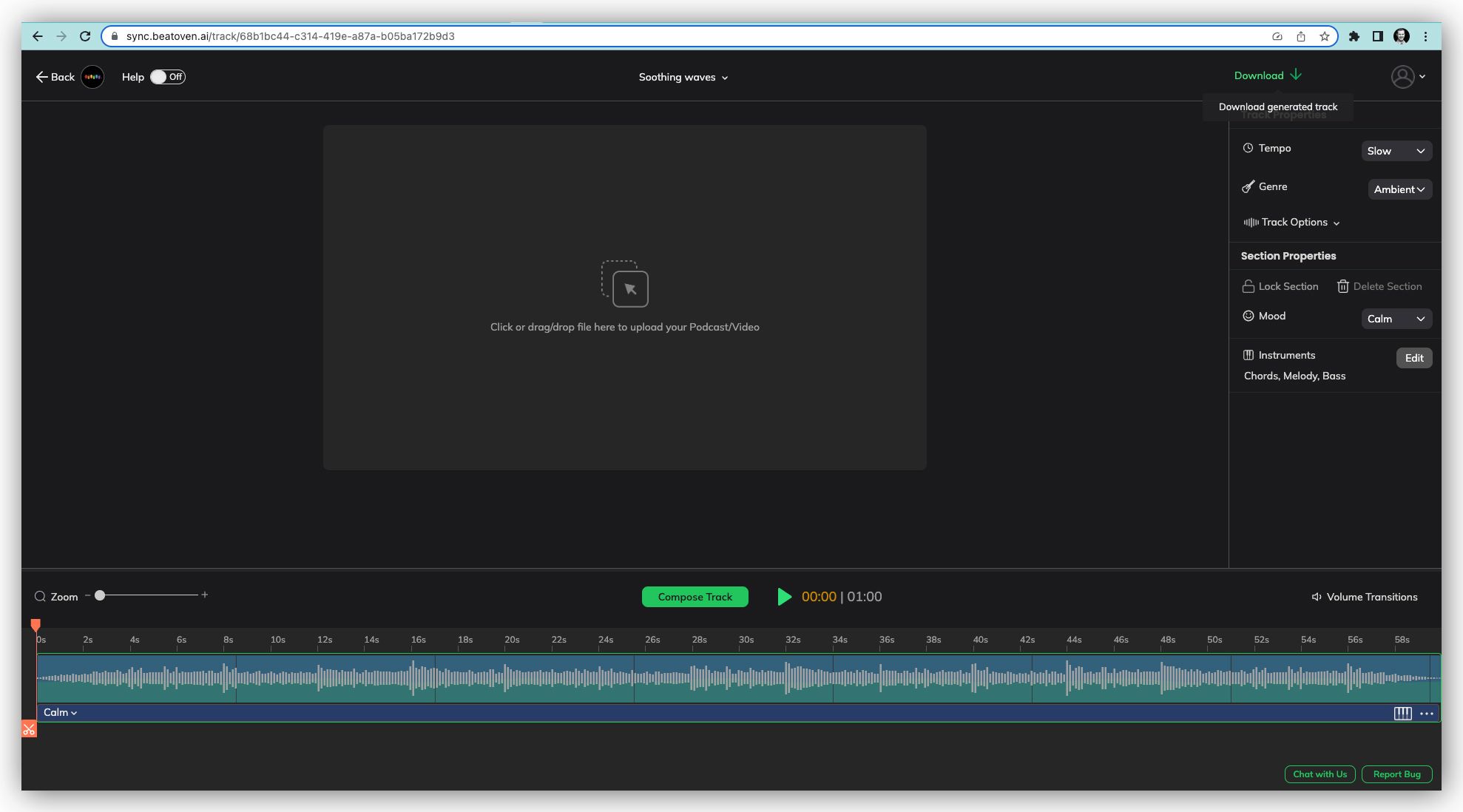 With Beatoven, I can create unique, royalty-free music for my video projects. And it sounds pretty darn good! I select a genre/style, make cuts, choose a mood, and hit compose to let the AI work its magic. You can create and download up to 15 minutes of music per month for free (you need to credit the tool). If you want 60+ minutes of music per month, multiple users, and no attribution, it runs $20/month and up.