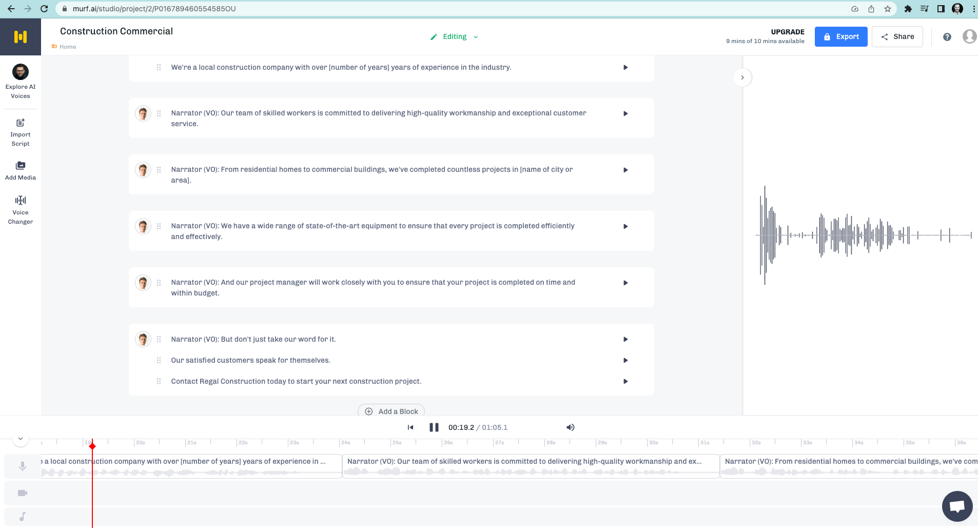 Murf Studio has over 120 AI voices in more than 20 languages. I use the tool to upload and sync my videos, images, and music with a voice. It's user-friendly and versatile. The free trial provides 10 minutes of VO to get the idea. After that, it costs $19 or $26 per month, depending on the quantity of voice-over needed and access to premium features such as voice cloning and transcription.