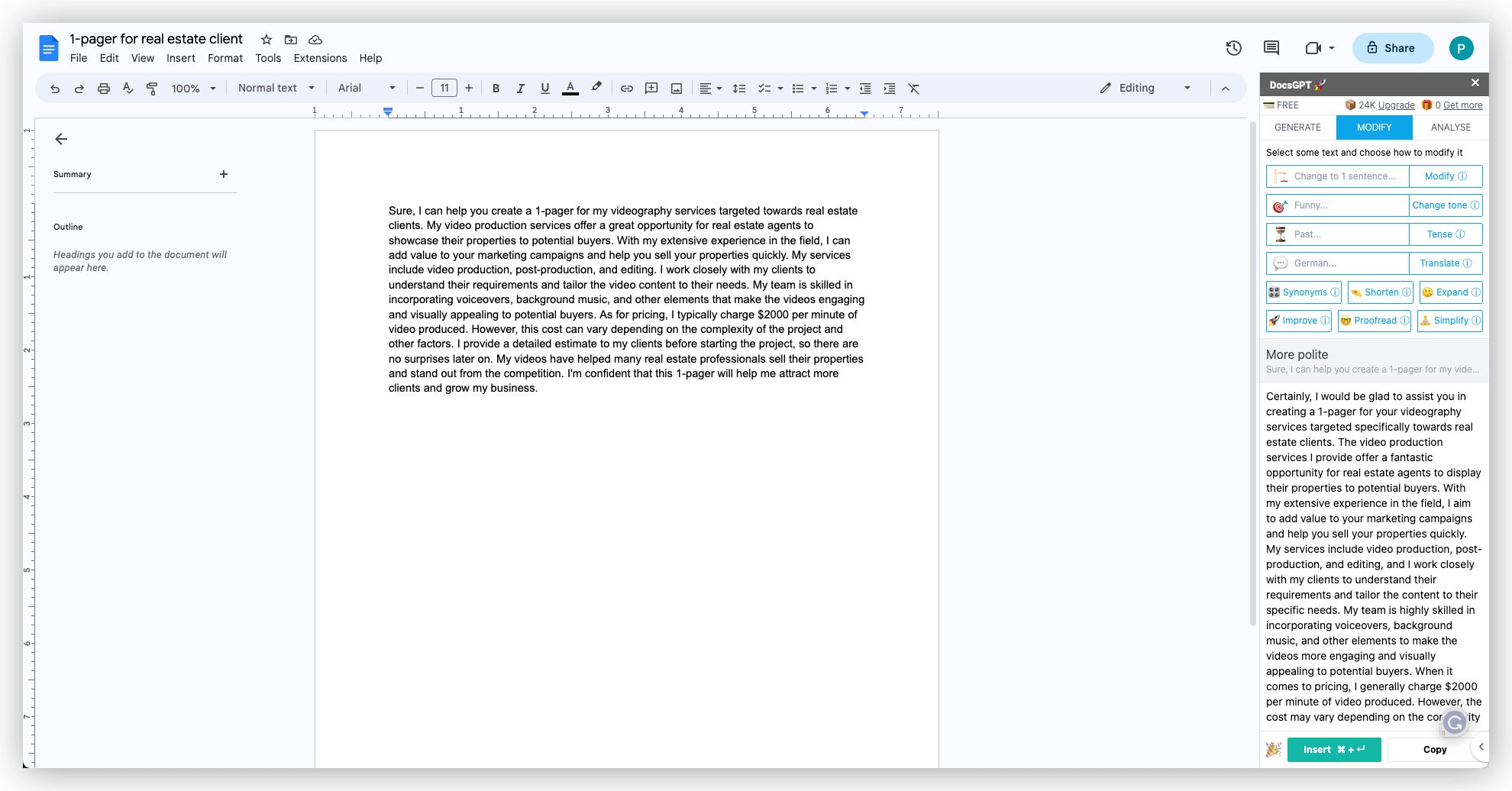 DocsGPT is a very affordable ChatGPT-powered Chrome extension integrated with Google Docs. Instead of repeatedly copying and pasting from ChatGPT into Google docs, this extension integrates GPT directly into Google Docs. It saves me a big step! I use this tool for generating social posts and short-form content. However, there is one drawback: DocsGPT is clunky for longer-form writing. That’s because you need to highlight text in the doc and press the sidebar buttons to “modify” or iterate upon it.