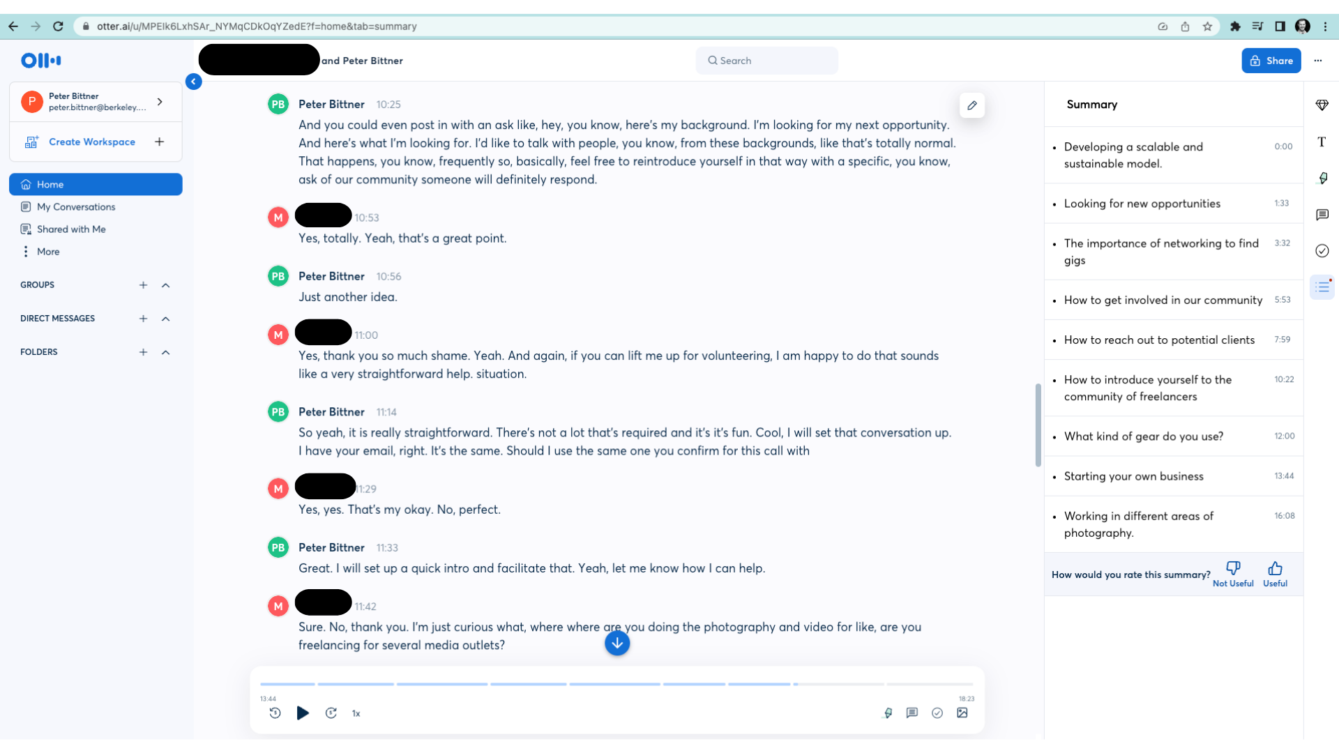 Otter AI keeps me organized during client meetings. It records, transcribes, and generates summaries of all my in-person or virtual meetings in real time. You can also connect it to your Google calendar, allowing it to directly transcribe Google Meet or Zoom calls (even the ones you are a guest on.)