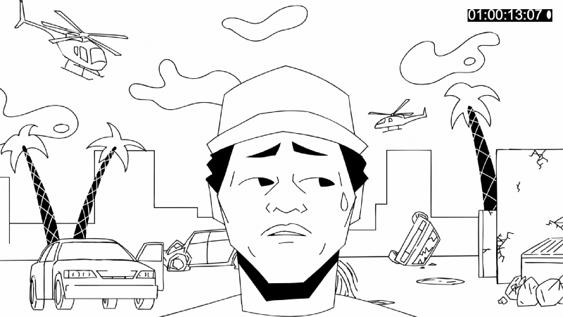 The two-week animatic phase begins once everything is approved. In animatics, the designer places static drawings over the fully-edited video. “Sometimes they’ll have some very light, mild animation involved, but it’s black and white,” Jason said. “It’s to give Red Bull a rough idea from a storytelling perspective of what the characters will be doing during the animated sequences.”